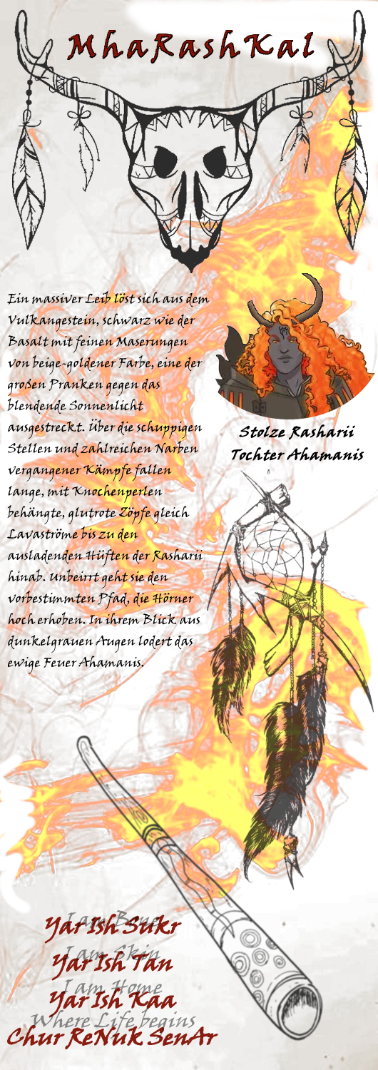 MhaRashKal ist für ihre Gegner ein furchteinflößender Anblick: als eine mit 1,93 Metern relativ hoch gewachsene und kräftige Rasharii mit großen Pranken wurde ihr der Weg als RaSho vorherbestimmt und er hat sie auch bereits gezeichnet. Ihre Haut sieht vom Weitem einheitlich glatt und dunkelgrau aus, doch bei näherem Hinsehen lassen sich - ähnlich wie es bei Vulkangestein durch Mineralablagerungen vorkommt - feine Maserungen von rostroter bis beige-goldener Farbe feststellen. Auch ist die Glätte eine Täuschung, ihre Haut trägt viele rauere Stellen, ebenso wie einige Narben. Lange glutrote Zöpfe züngeln sich einem Lavastrom gleich direkt von ihren beigen Hörnern bis unter ihre Hüfte und die eingeflochtenen Knochenperlen sind oft der einzige Schmuck, den die Rasharii trägt. Ihre Augen sind unauffällig grau, dennoch brennt stets das Feuer ihres Temperaments in ihnen.
