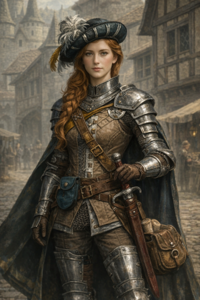 Die kastanienblonden Haare sind zu einem ordentlichen Zopf gebunden, und ihre Kleidung ist sauber und gepflegt, teilweise elegant und doch zweckmäßig. Alles an ihr wirkt bedacht – von der Art, wie sie steht, bis hin zum ruhigen Atem, der eine innere Stärke verrät, die lauter spricht als jedes Wort.