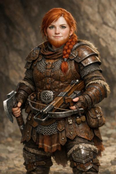 Mit etwa 1,35 Schritt Körpergröße ist sie stämmig gebaut, breit in den Schultern und fest verwurzelt wie es sich für eine Tochter des Berges gehört. Rötliches Haar fällt meist zu einem praktischen Zopf gebunden über ihren Rücken, während ein feiner, gepflegter Flaumbart Kinn und Wangen ziert — ein stilles Zeichen ihres Erwachsenwerdens. Ihre Hopfengrünen Augen verraten Wachsamkeit, aber auch Staunen über all das, was jenseits der Hallen Nilzadans liegt.