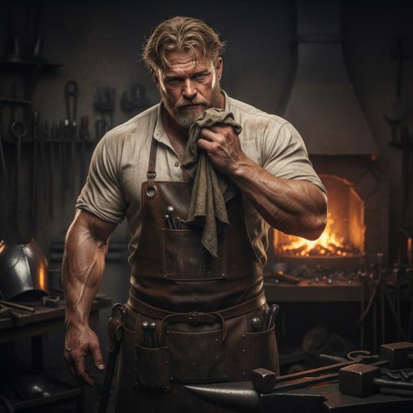 Eine massive Statur, mit der er ganze Türen ausfüllt und ein hartes Gesicht prägen seine Erscheinung. Durch sein schweres Tagewerk sieht man ihn oft verschwitzt und schmutzig, während und nach der Arbeit. Auch seine Hände, die sicher den Begriff „Pranken“ verdient haben, passen in das Bild. Reicht man ihm die Hand, ist sein Griff eisern und seine Haut rau wie verwitterter Stein. Seine blonden Haare und sein Bart sind stets wohl gestutzt und gepflegt und könnten darauf hinweisen, dass er sich trotz seiner körperlich anfordernden und verstaubten Arbeit niemand ist, der sich gehen lässt. Seine Stimme ist tief wie ein Stollen und trägt sich immer etwas verschliffen hinaus. Seine Augen liegen tiefer in seinen Augenhöhlen und könnten unter anderen Umständen darin verschwinden, doch das intensive Grün der Iris verhindert es und sticht einem förmlich entgegen.