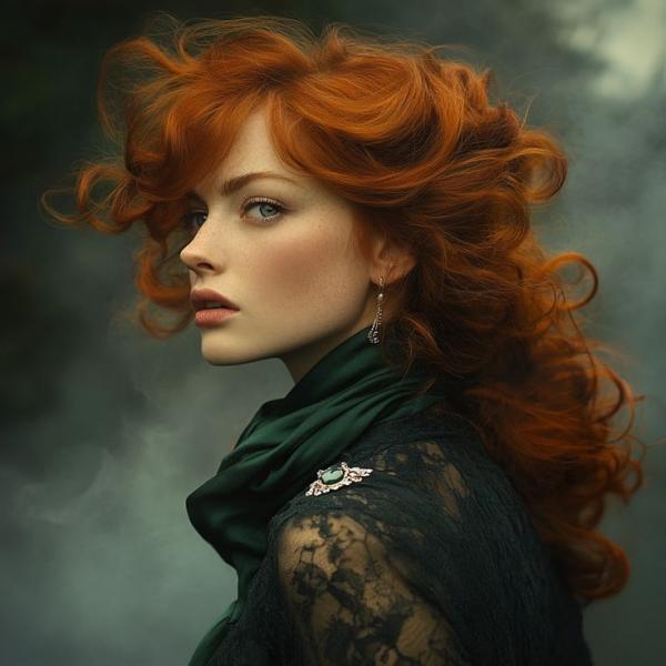 Spiegelt das Licht der Sterne in ihrem langen lockigen Haar entflammt es in tiefem Goldton, im Sonnenlicht erstrahlt es in flackernden Fuchsrotschattierungen je nachdem ob Schatten oder Sonnenstrahlen, die das Dickicht der Wälder durchbrechen, es berühren.