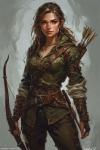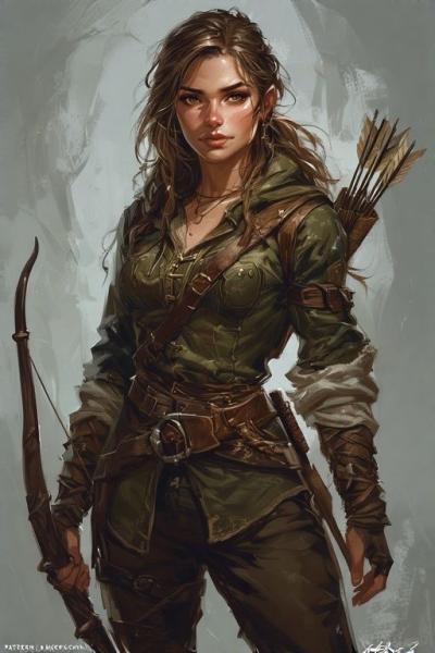Ein köcher voller Pfeile hängt sicher über der Schulter, die Haltung verrät das Selbstverständniss einer Jägerin, oder einer, die gelernt hat, lautlos durch die Wildnis zu ziehen.