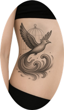 Vor einem eher dezent gehaltenen Käfig, erhebt sich ein Phönix, dessen Schwanzfedern einem unruhigen, wellenwerfenden Meer gleichen, in die Lüfte.