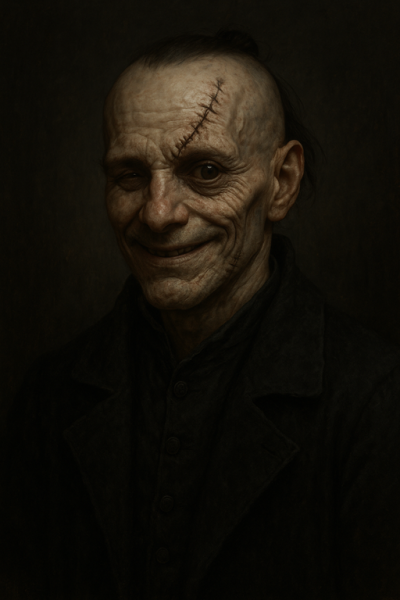 Ein kleiner, schmaler Mann mit zu viel Haut für zu wenig Fleisch. Eine grobe Naht zieht sich quer über sein Gesicht, als hätte jemand ihn in Eile wieder zusammengesetzt. Sein rechtes Auge ist nichts als eine hölzerne Kugel mit aufgemalter Iris, das rechte Ohr fehlt gänzlich. Aus den verbliebenen Haarsträhnen hat er einen schiefen Knoten gebunden.